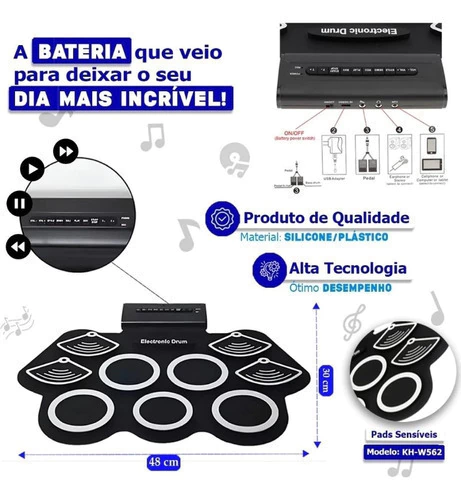 A Bateria que veio para deixar o seu dia mais incrível, com 9 pads para tocar e acompanhando pedais e baquetas essa bateria eletrônica vai fazer sucesso no seu dia a dia e ajudando você a treinar!