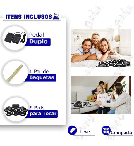 Itens inclusos: 1 Bateria Eletrônica, 2 Baqueta, 2 Pedal, 1 Fonte de Alimentação, 1 Cabo Usb, 2 Cabo P2, 1 Manual (inglês)