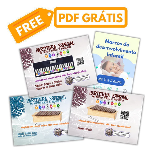 >>Também terá acesso através de QR Code a um 2o. BÔNUS, que é MÉTODO que desenvolvi e que utilizo nos atendimentos com autistas. Trata-se de 3 kits de partituras musicais adaptadas com notas, cores e números, totalmente GRÁTIS, para que você tenha as ferramentas certas para trabalhar a musicalização com crianças autistas, utilizando da música e instrumentos musicais para trabalhar habilidades.