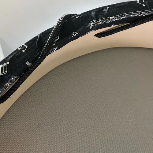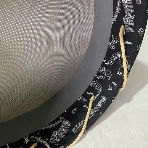 Indicado p/ uso em escolas de música, clínicas terapêuticas com crianças especiais, etc. Tambor construído de forma artesanal, em corpo de madeira resistente, revestido com tecido estampa em tema de notas musicais, corda trançada para manter 1 cm acima do chão, e pele asséptica preta super resistente.