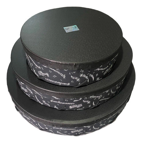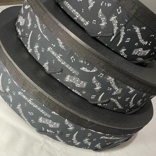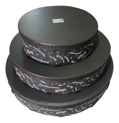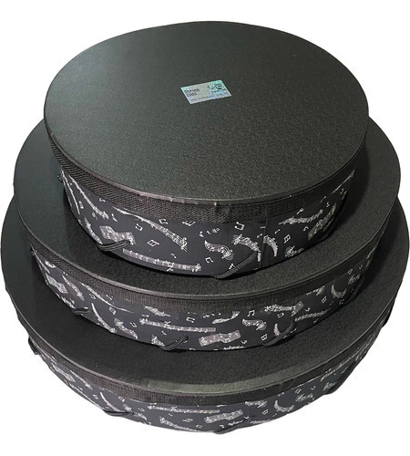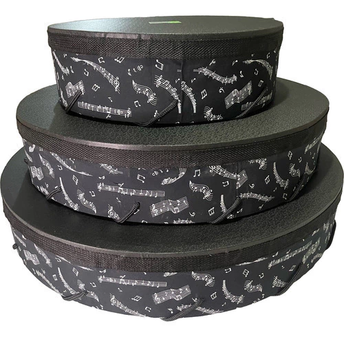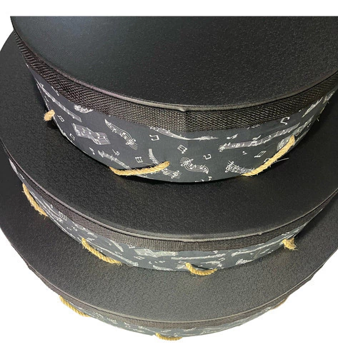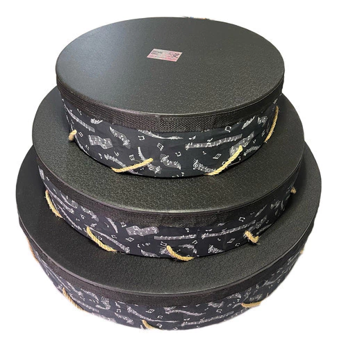 Kit Tambores de Chão +-90cm +-70cm +-50cm diâmetro, pele asséptica super resistente, estrutura em madeira com camadas reforçadas e estampa em tecido com tema de notas musicais, corda trançada na parte inferior para elevar o tambor do chão.