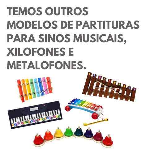 Partituras adaptadas com notas, cores e números, o que facilita para a criança conseguir executar a melodia das músicas de forma fácil.