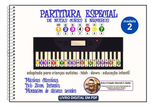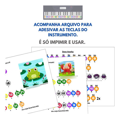 Acompanha arquivo "adesivos" para imprimir em folha A4 adesiva, recortar e adesivar as teclas do instrumento, para que a criança consiga fazer o pareamento das cores da partitura no instrumento.