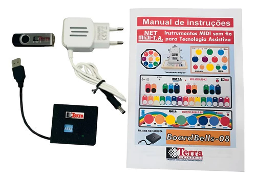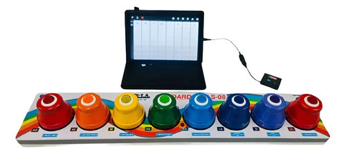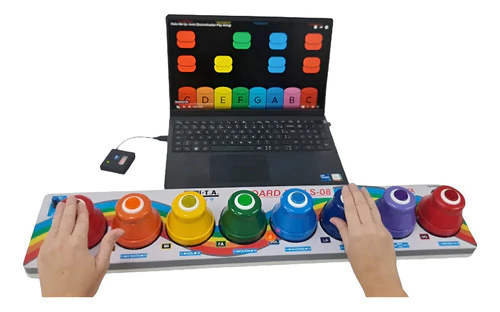 Sinos Eletrônicos + QR Code para baixar as partituras em PDF com notinhas coloridas. Acompanha pen drive com banco de timbres de vários instrumentos, video explicativo, transmissor para conectar via usb no notebook, (Ipad e Iphone necessita de conector próprio), cabo e carregador via USB.