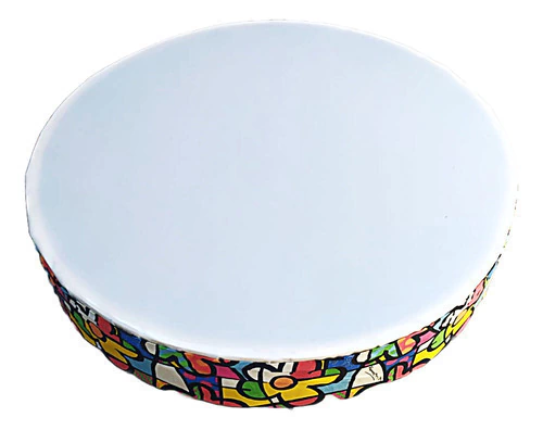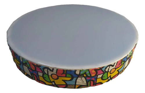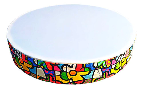 Tambor de Chão 1 Metro diâmetro com um resistente tecido original licenciado estampa Romero Brito. Pele Sintética resistente. Indicado para musicalização infantil e como recurso terapêutico. (OBS: +- 1 metro podendo haver variação de alguns centímetros a menos, pois é um produto Artesanal). Permite várias crianças tocarem ao mesmo tempo, com as mãos ou com baquetas de pontas macias (não incluso). Indicado p/ uso em escolas de música, clínicas terapêuticas com crianças especiais, etc. Tambor construído de forma artesanal, em corpo de madeira revestido com tecido de alta resistência original licenciado estampa Romero Brito. e Pele sintética.