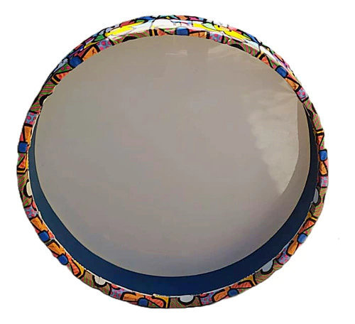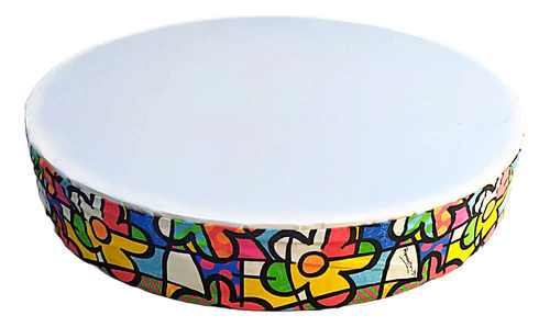 Tambor de Chão de +- 1,20 Metros de diâmetro com um resistente tecido original licenciado estampa Romero Brito. Pele sintética. Indicado para musicalização infantil e como recurso terapêutico. (OBS: +- 1,20 metros podendo haver variação de alguns centímetros a menos, pois é um produto Artesanal). Permite várias crianças tocarem ao mesmo tempo, com as mãos ou com baquetas (não incluso). Indicado p/ uso em escolas de música, clínicas terapêuticas com crianças especiais, etc. Tambor construído de forma artesanal, em corpo de madeira revestido com tecido de alta resistência com estampa Romero Brito, e Pele Sintética.