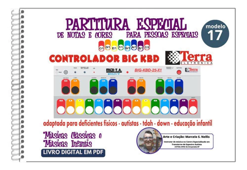 Controlador Midi + QR Code para baixar partituras PDF Kids Music, com várias músicas infantis com notinhas coloridas.